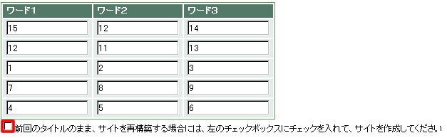 上図の赤い枠で囲まれたチェックボックスにチェックを入れると、前回ランダムに作成したタイトルを引き継いで、各ページのタイトルを変更せずに、サイトの修正を行うことができます。